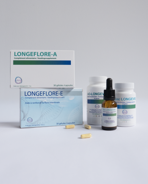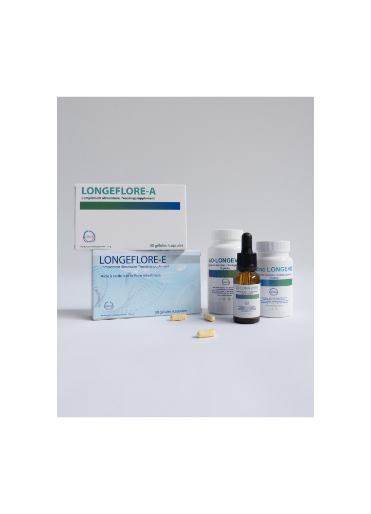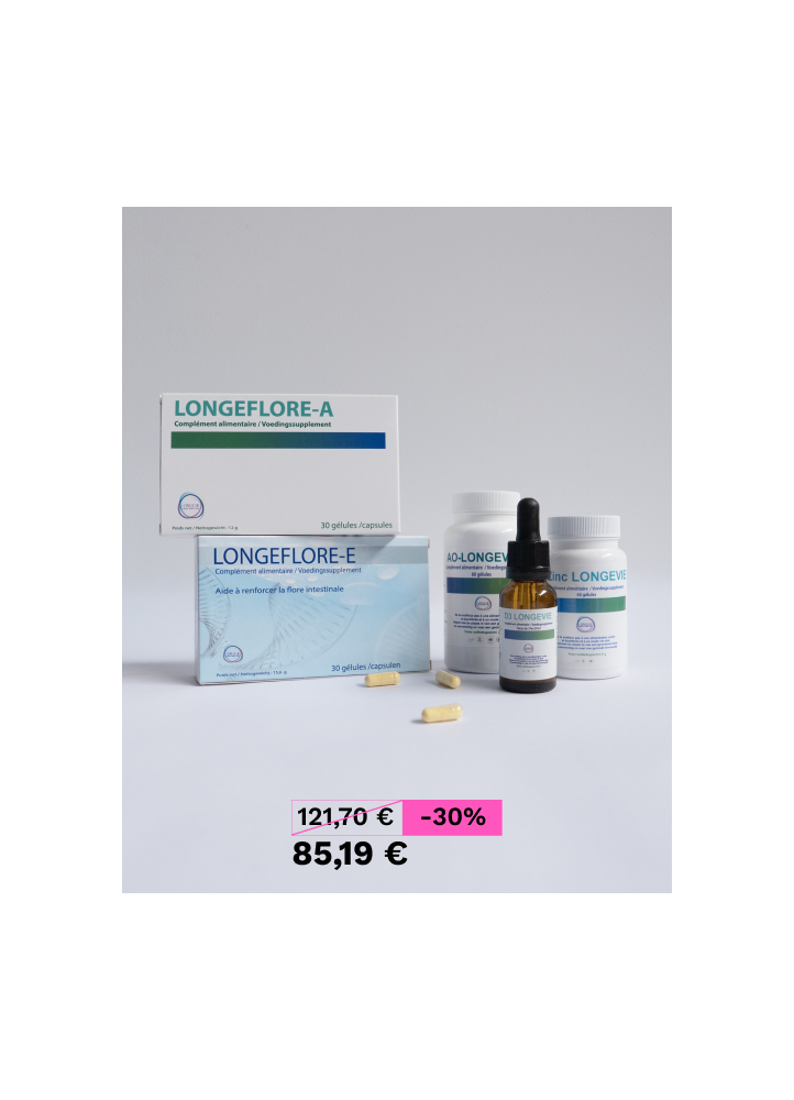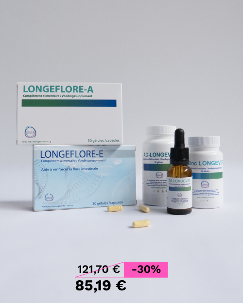 Un pack simple et efficace pour l’hiver : LONGEFLORE A (adulte) + LONGEFLORE E (enfant) pour soutenir le microbiote, AO-LONGEVIE (antioxydants) + D3-LONGEVIE + Zinc pour contribuer au fonctionnement normal du système immunitaire et protéger les cellules du stress oxydatif. Pensé pour des posologies lisibles et une routine que l’on tient vraiment.