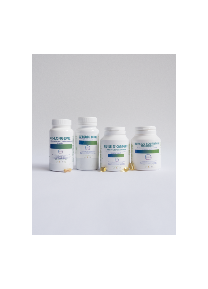 Routine peau hiver pour préparer l’épiderme au froid et à la fatigue cutanée : Huile de Bourrache + Huile d’Onagre (souplesse & barrière lipidique), AO-LONGEVIE (soutien antioxydant), LUTEINE DHA (caroténoïdes + oméga-3). Objectif : éclat conservé, peau confortable, routine simple à tenir.
