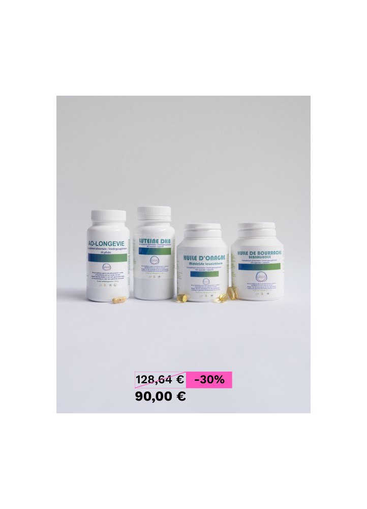 Le froid, l’air sec et le rythme plus tendu de l’hiver fragilisent la barrière lipidique de la peau et favorisent la fatigue cutanée. Ce pack combine 4 leviers complémentaires : des oméga-6 spécifiques (bourrache & onagre) pour la souplesse, un soutien antioxydant (AO-LONGEVIE) pour accompagner la défense contre le stress oxydatif, et le duo lutéine + DHA pour contribuer à l’éclat et à l’équilibre global.