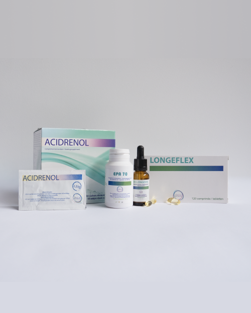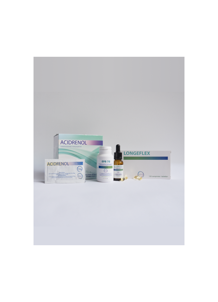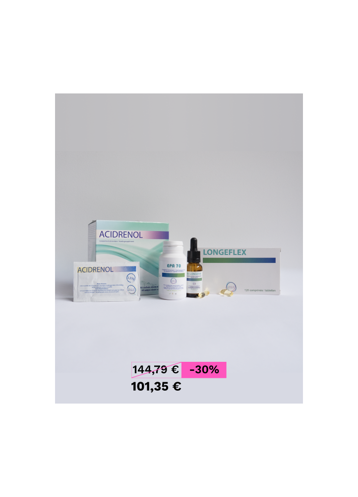 Le froid et les changements de rythme accentuent souvent les sensibilités et la raideur. Ce pack associe quatre leviers complémentaires : le soutien articulaire (LONGEFLEX), l’entretien du terrain et de la récupération quotidienne (ACIDRENOL), un apport en oméga-3 (EPA 70), et la vitamine D (D3-LONGEVIE), qui contribue au maintien d’une ossature normale et au fonctionnement normal des muscles. Résultat recherché : une mobilité plus fluide, des sensations apaisées, une routine simple à suivre.
